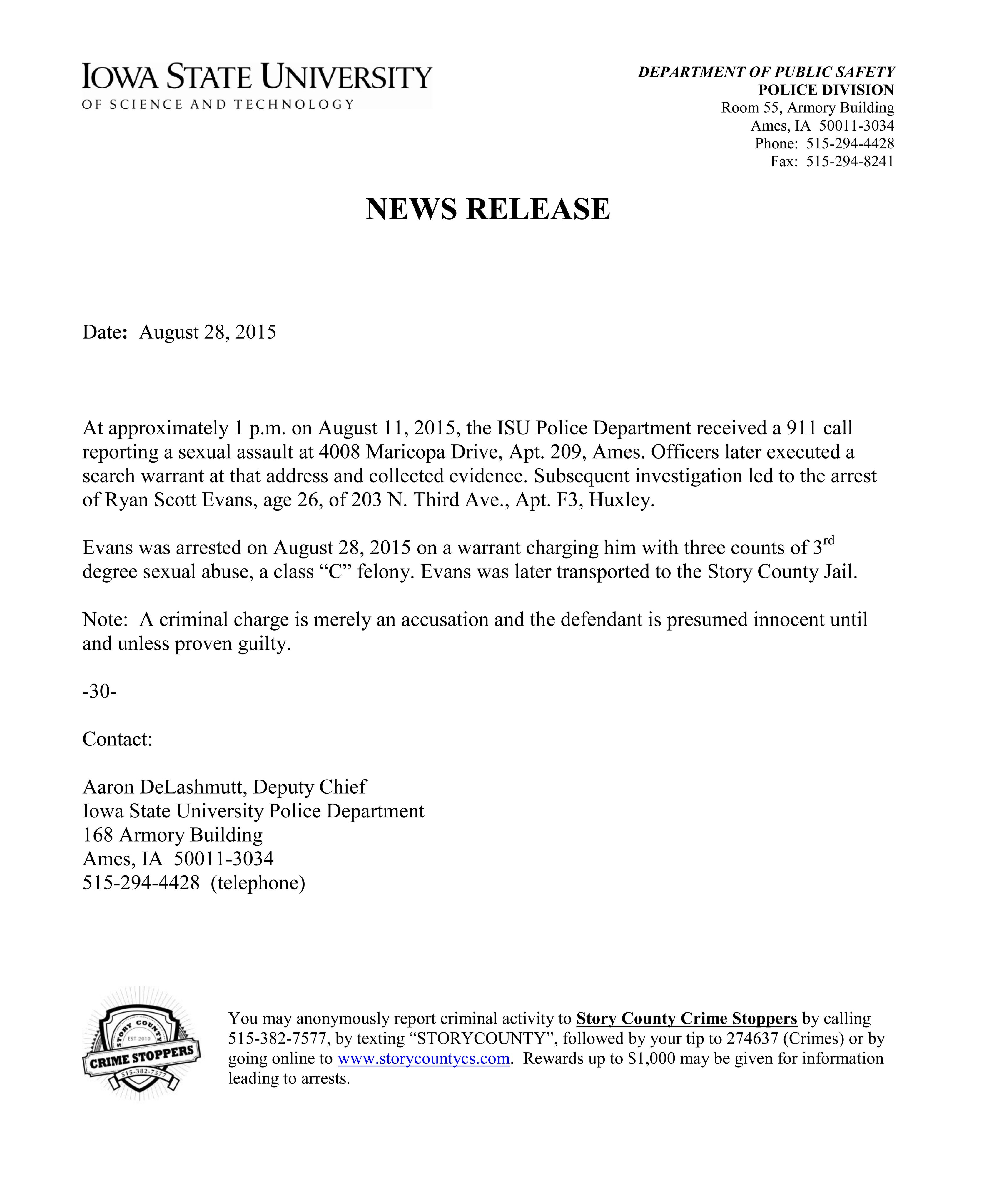 Iowa State University Police Department On Twitter Isu Police Arrest Ryan Evans Of Huxley For Three Counts Of Sexual Abuse Class C Felony Http T Co Vqp3gcsjnf Twitter